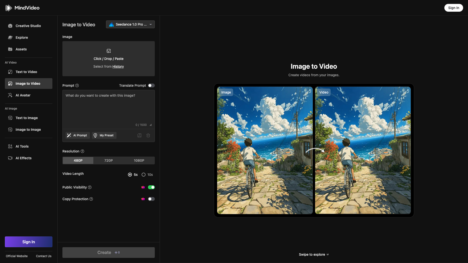 MindVideo Image to Video превращает статичные фотографии в короткие анимированные ролики с помощью нейросети. Достаточно загрузить изображение, задать подсказку и выбрать параметры — система сама сгенерирует видео.