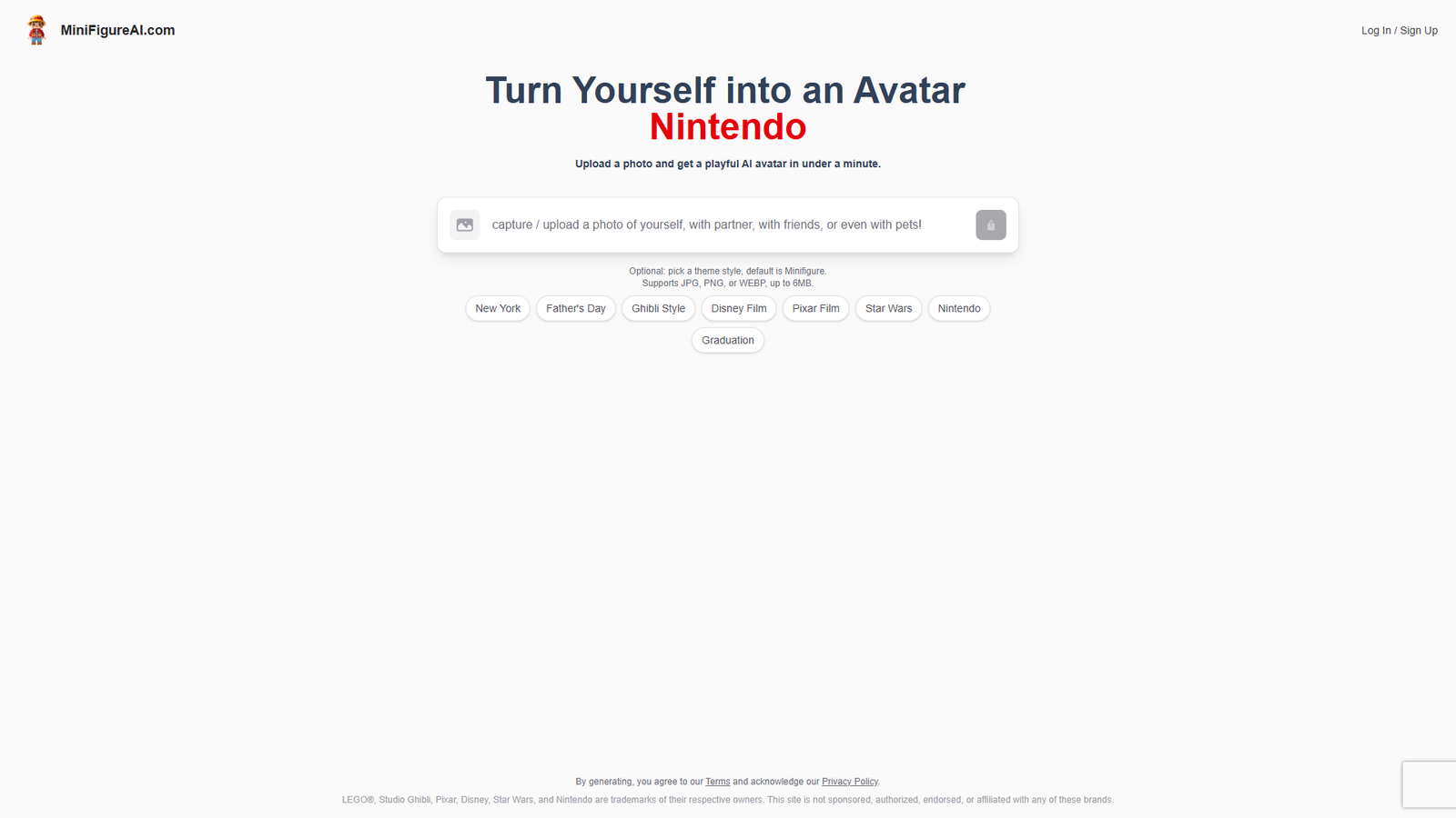 Пользователь загружает портрет в формате JPG, PNG или WEBP размером до 6 МБ. Нейросеть анализирует черты лица и создает стилизованный аватар. Базовый стиль — Minifigure, но доступен выбор тематик: от Nintendo и Pixar до Disney, Star Wars, Ghibli или выпускного.
