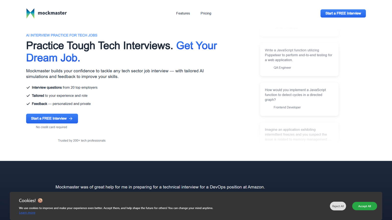 Mockmaster помогает готовиться к техническим собеседованиям в IT с помощью реалистичных AI-симуляций. Пользователь выбирает направление — Frontend, Backend, Fullstack, QA, Data Science или DevOps — и получает серию вопросов, близких к формату реальных интервью в крупных компаниях.