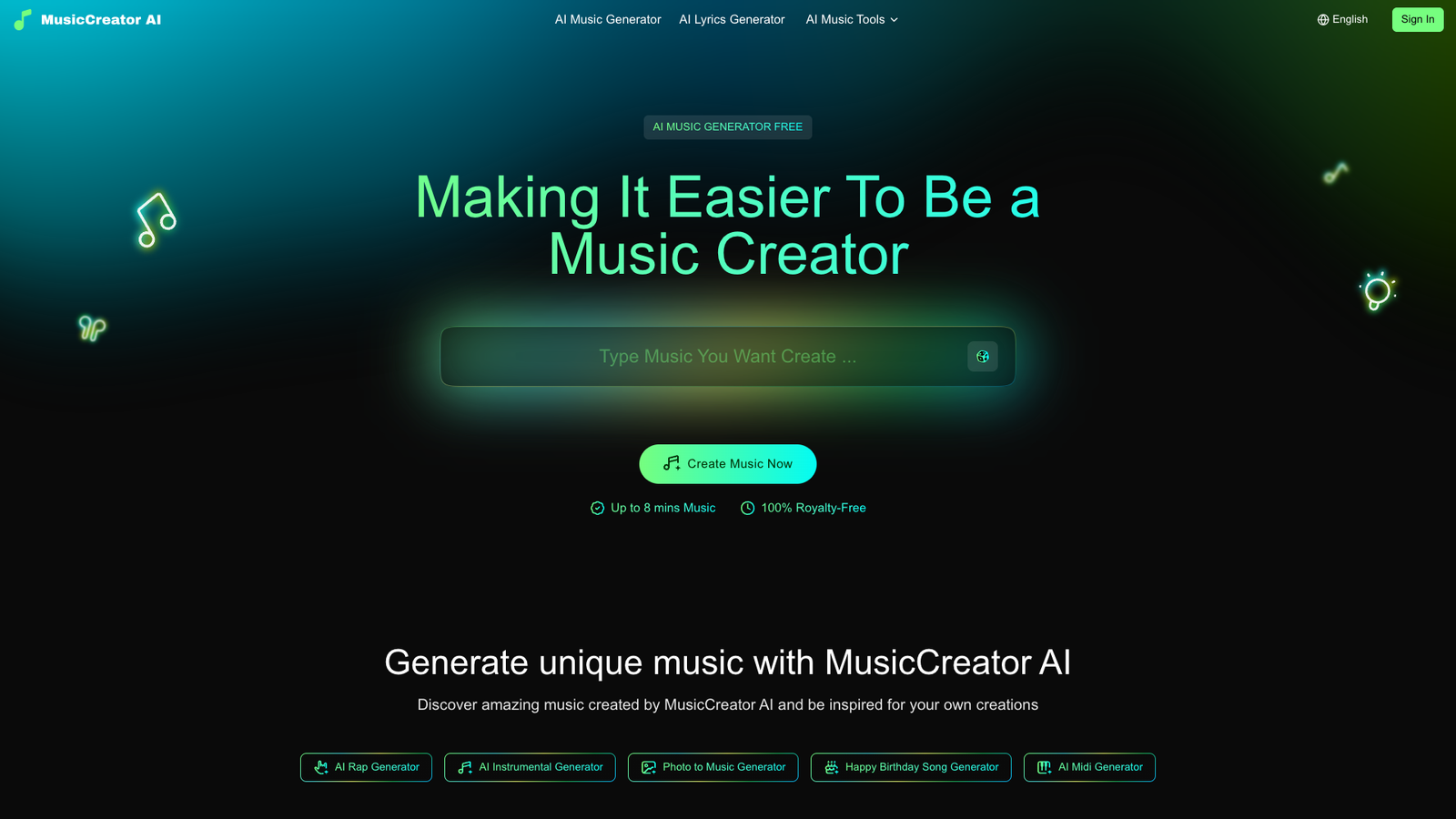 Сгенерированные треки отмечены как 100% royalty-free. Это удобно для создателей контента, которым нужна музыка без сложных лицензионных согласований. MusicCreator AI ориентирован на быстрый цикл: придумать идею, задать параметры и сразу получить пригодный для проекта аудиофайл.