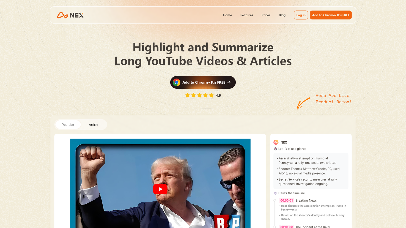 Nex — это AI-ассистент для быстрого разбора длинных YouTube‑роликов и статей прямо в браузере. Расширение для Chrome анализирует контент и выдаёт структурированное краткое изложение и ключевые моменты в один клик.
