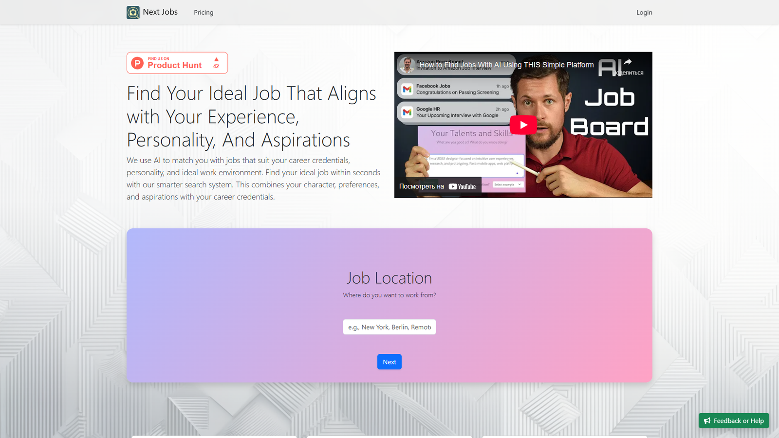 Next Jobs использует ИИ, чтобы подбирать вакансии не только по ключевым словам, а по реальному совпадению с вашим опытом, личностью и ожиданиями от рабочего места. Пользователь указывает карьерные данные, желаемый формат и локацию работы, а система строит более точный профиль кандидата.