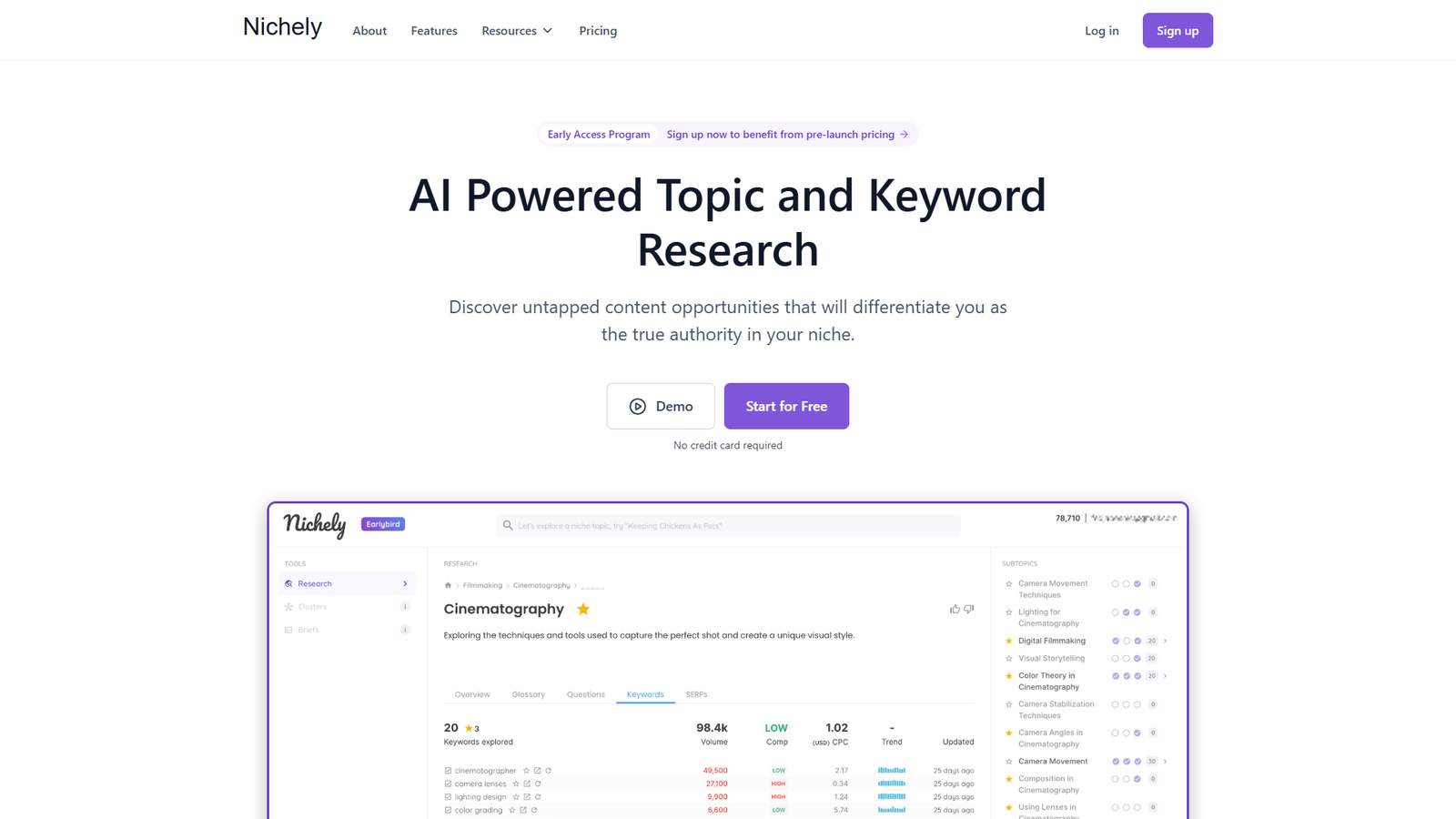 Nichely — это AI-сервис для глубокого исследования тем и ключевых слов, который помогает доминировать в вашей нише за счёт продуманной контент-стратегии.