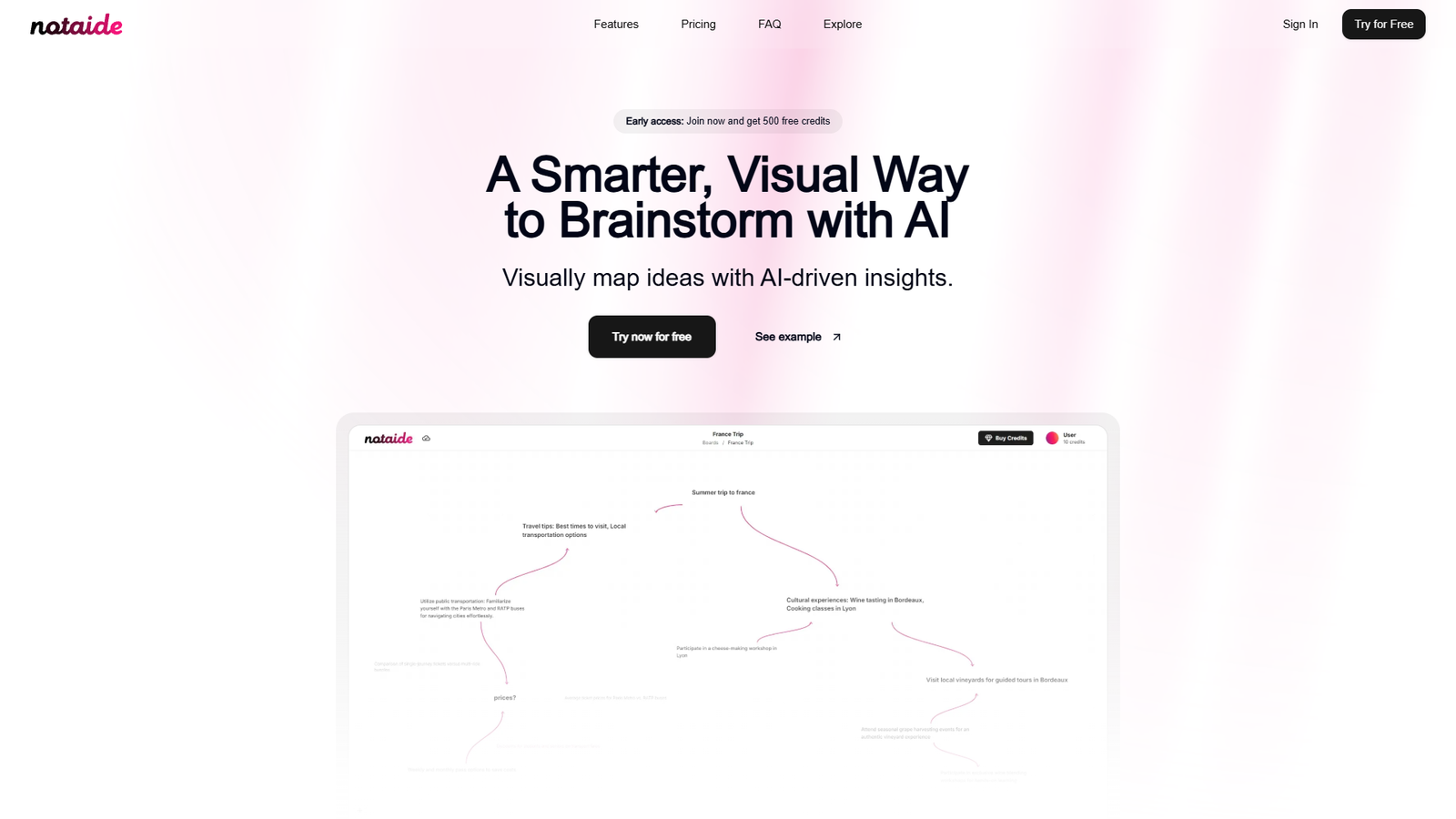 Notaide — инструмент для визуального мозгового штурма с поддержкой ИИ. Он помогает не просто записывать идеи списком, а сразу раскладывать их по карте, видеть связи и быстро наращивать новые ветви мыслей.
