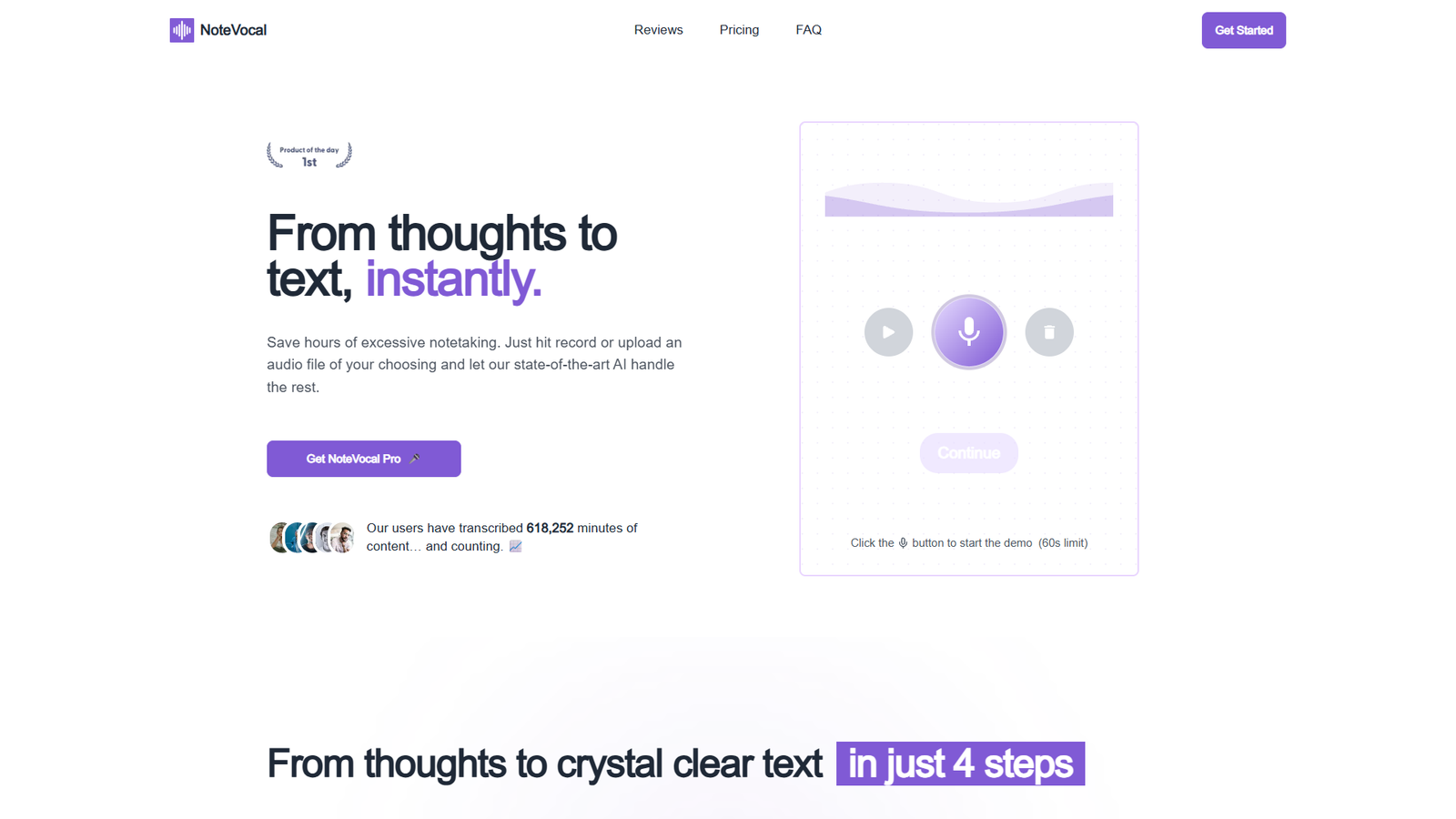 NoteVocal превращает устные мысли в структурированный текст за несколько минут. Достаточно нажать запись или загрузить аудиофайл — остальное берёт на себя нейросеть.