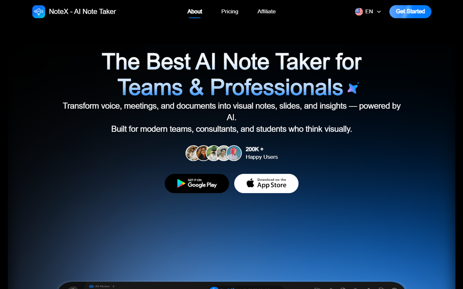 NoteX — это интеллектуальный помощник для конспектирования, который превращает лекции, встречи и документы в структурированные материалы для учебы и работы. Пользователь загружает текст, аудио или использует запись встречи, а нейросеть собирает из этого понятные заметки, визуальные схемы и слайды.
