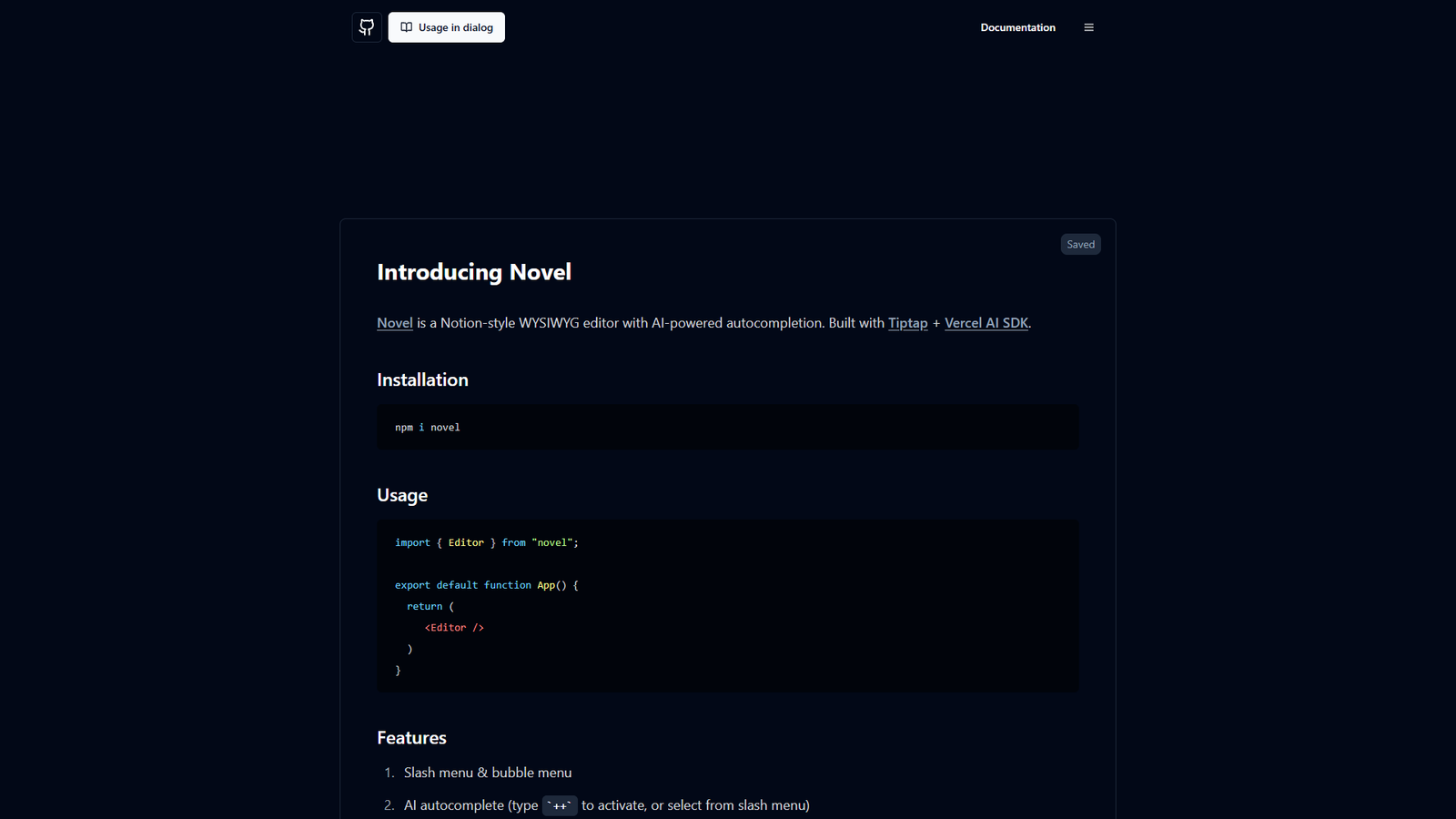 Novel — Notion‑style WYSIWYG‑редактор для веб‑приложений с AI‑автодополнением текста. Он создан как готовый компонент, который можно быстро встроить в свой продукт и получить современный редактор «как в Notion» с удобными меню и расширениями.
