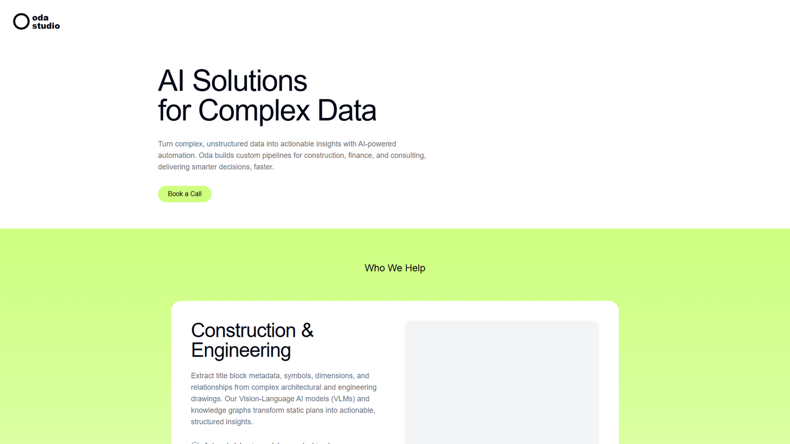 Основной фокус Oda Studio — отрасли с насыщенной документацией и чертежами: строительство, инжиниринг, финансы и консалтинг. Платформа строит кастомные AI-пайплайны под конкретные бизнес-процессы, чтобы ускорить принятие решений и повысить качество аналитики.