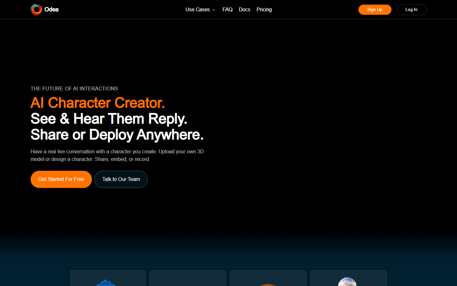 Odea — конструктор интерактивных AI-персонажей с визуальным и голосовым откликом. Пользователь создает персонажа, сразу видит его реакцию на экране и слышит ответы в реальном времени.