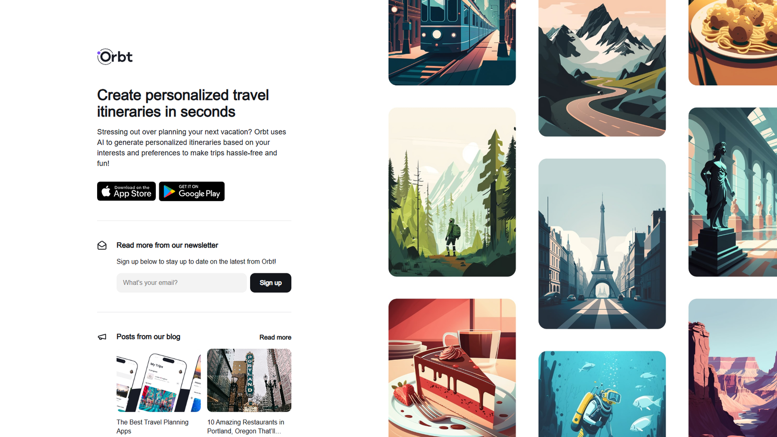 Orbt — умный AI-планировщик путешествий, который за секунды собирает персональный маршрут под ваши интересы, стиль отдыха и предпочтения. Вместо десятков вкладок с блогами и картами вы получаете готовый план поездки без лишнего стресса.