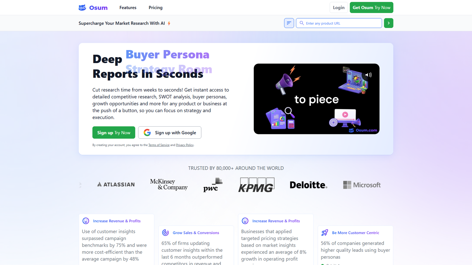 Osum — это AI‑платформа для ускорения маркетинговых и продуктовых исследований, которая превращает недели ручного анализа в секунды. Сервис помогает маркетологам, основателям и продуктовым командам быстро получать структурированные инсайты по любому рынку или продукту.