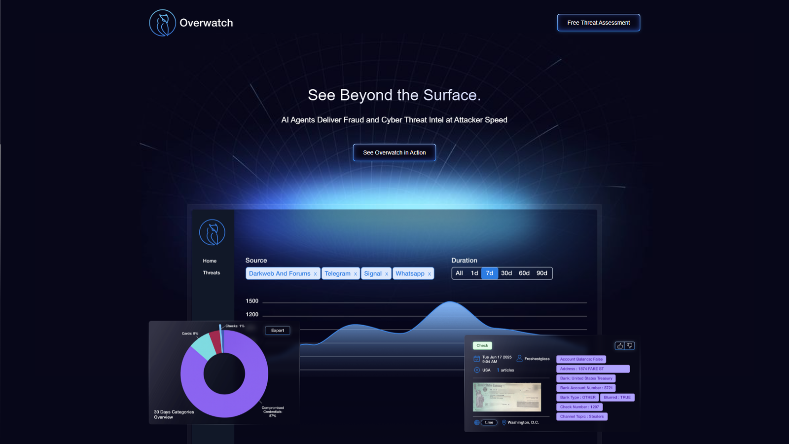 ИИ-агенты Overwatch Data круглосуточно отслеживают более 300 000 источников: от даркнета и закрытых форумов до соцсетей и открытых OSINT-ресурсов. Платформа автоматически выявляет потенциальные цифровые угрозы, утечки, мошеннические схемы и подозрительную активность, подавая их в удобном и приоритизированном виде.