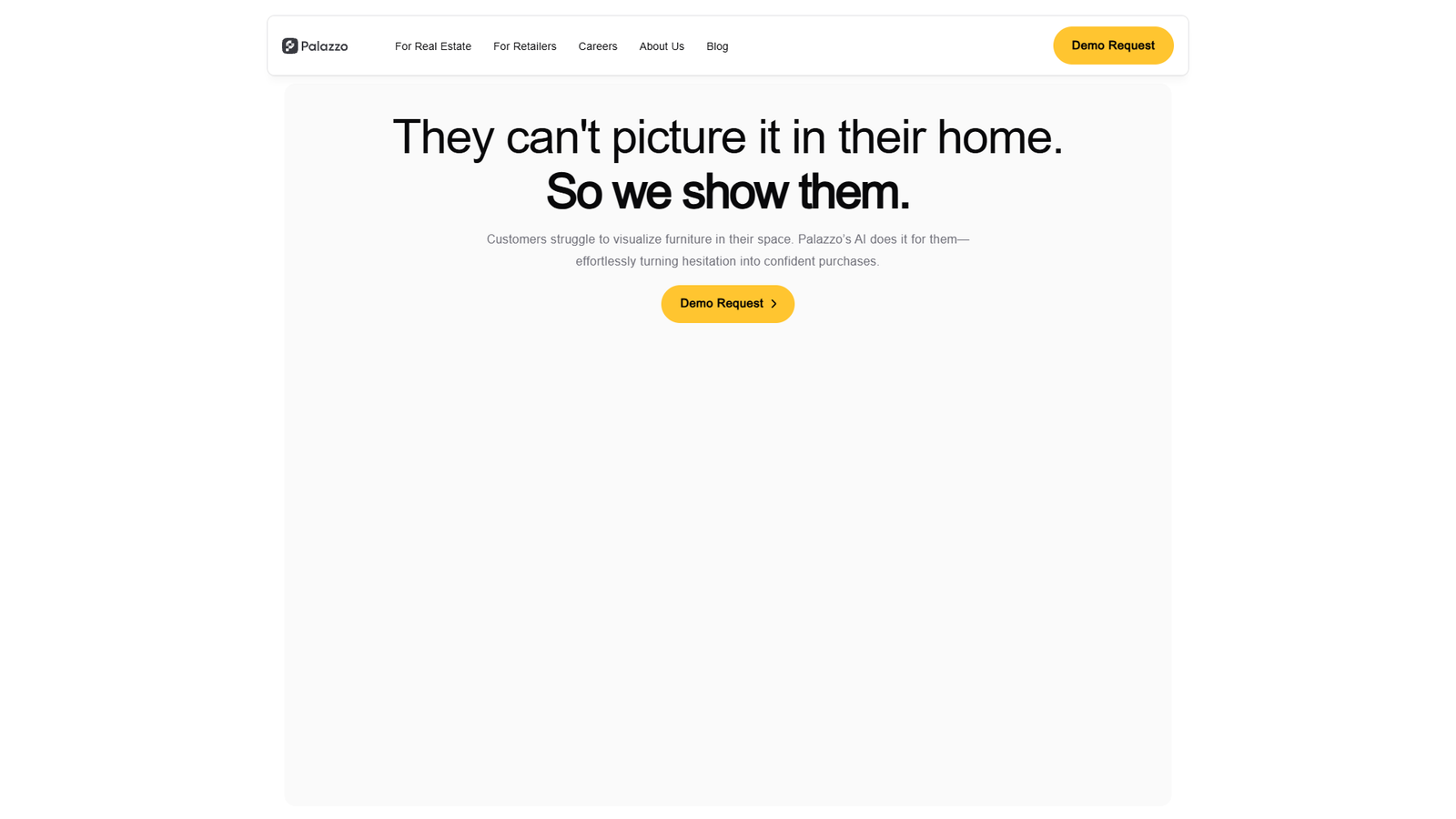 Palazzo — это AI-инструмент для визуализации мебели в реальных интерьерах по фото. Покупатель загружает снимок своей комнаты, а нейросеть за секунды показывает, как в этом пространстве будет выглядеть выбранный диван, стол или стеллаж.