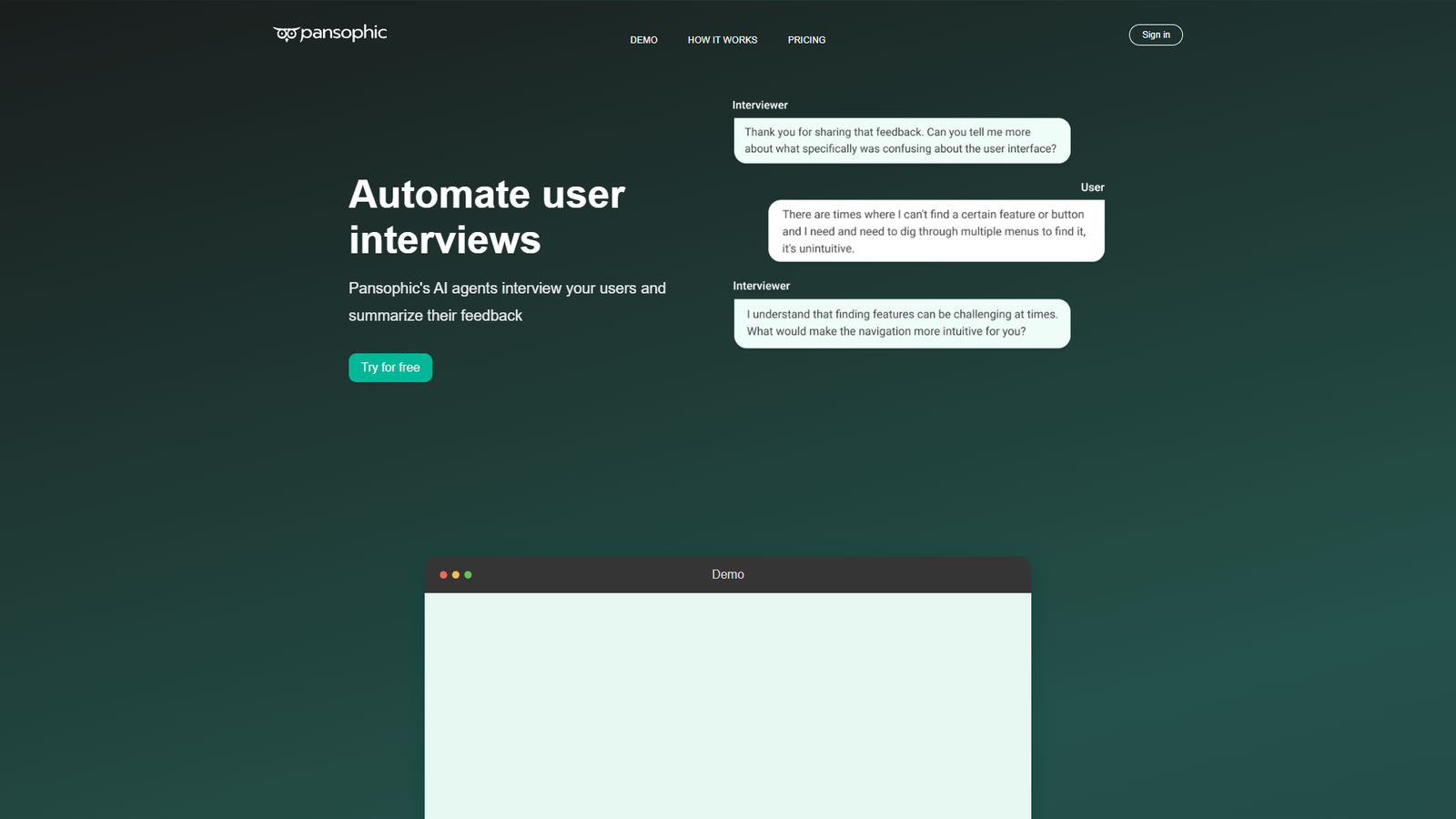 Pansophic — это сервис, который автоматизирует пользовательские интервью с помощью ИИ-агентов. Платформа берёт на себя рутинные созвоны и опросы, позволяя продуктовым командам быстрее собирать и анализировать обратную связь от клиентов.