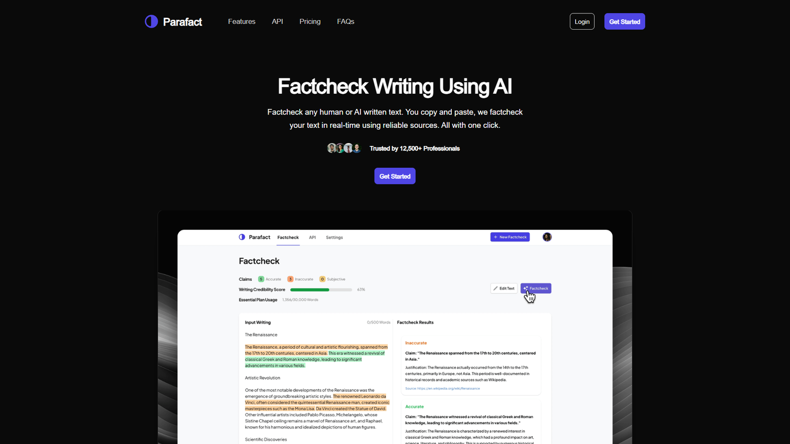 Parafact — это AI-сервис для мгновенной проверки фактов в любом тексте: написанном человеком или сгенерированном нейросетью. Достаточно скопировать и вставить фрагмент, а система автоматически проанализирует утверждения и сопоставит их с надежными источниками.