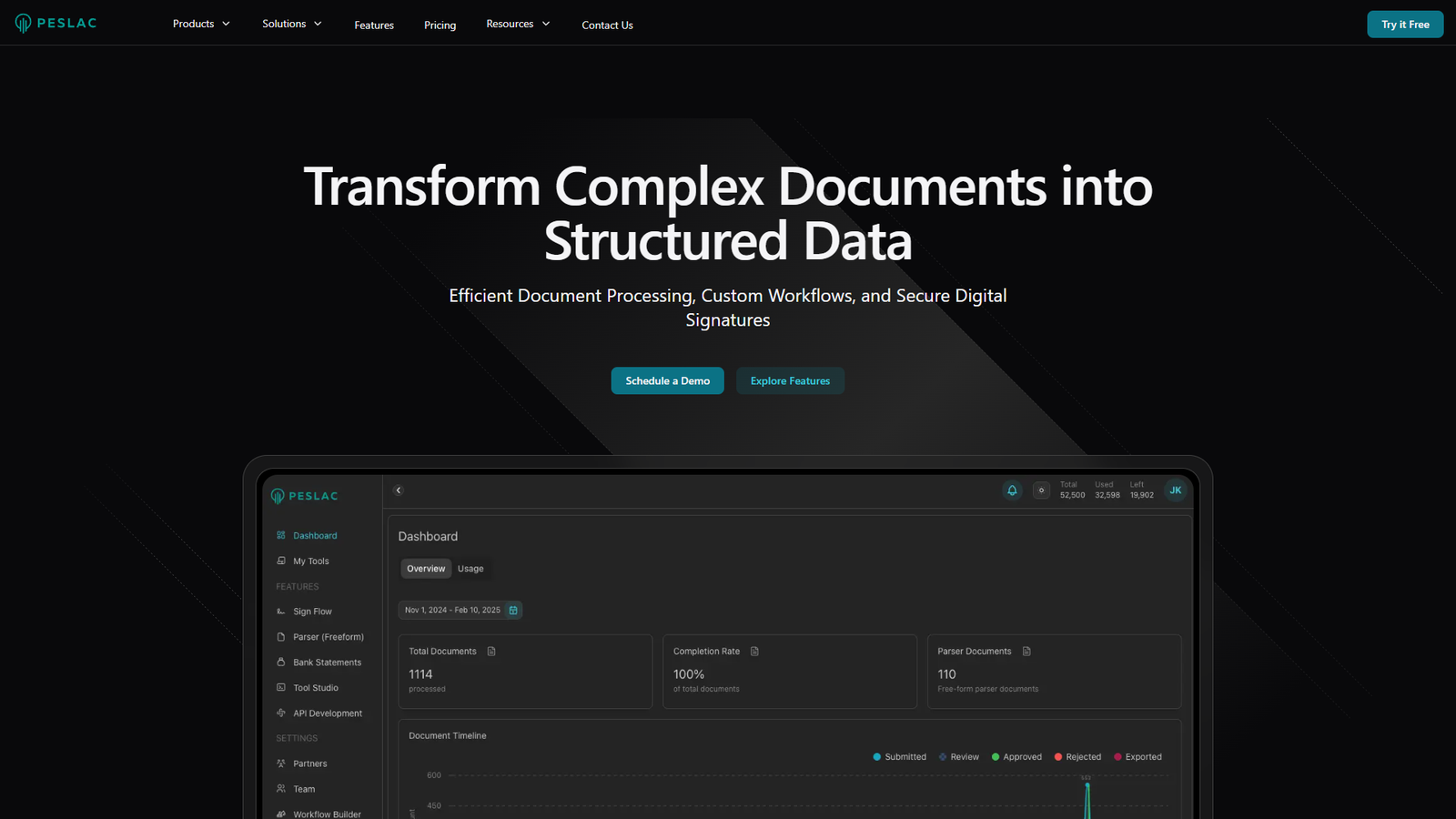 Peslac AI — это платформа интеллектуальной обработки документов, которая помогает превратить сложные, неструктурированные файлы в удобные для анализа данные. Сервис автоматизирует рутинные операции с документами и снижает нагрузку на команды, работающие с большими объёмами бумаг и PDF.
