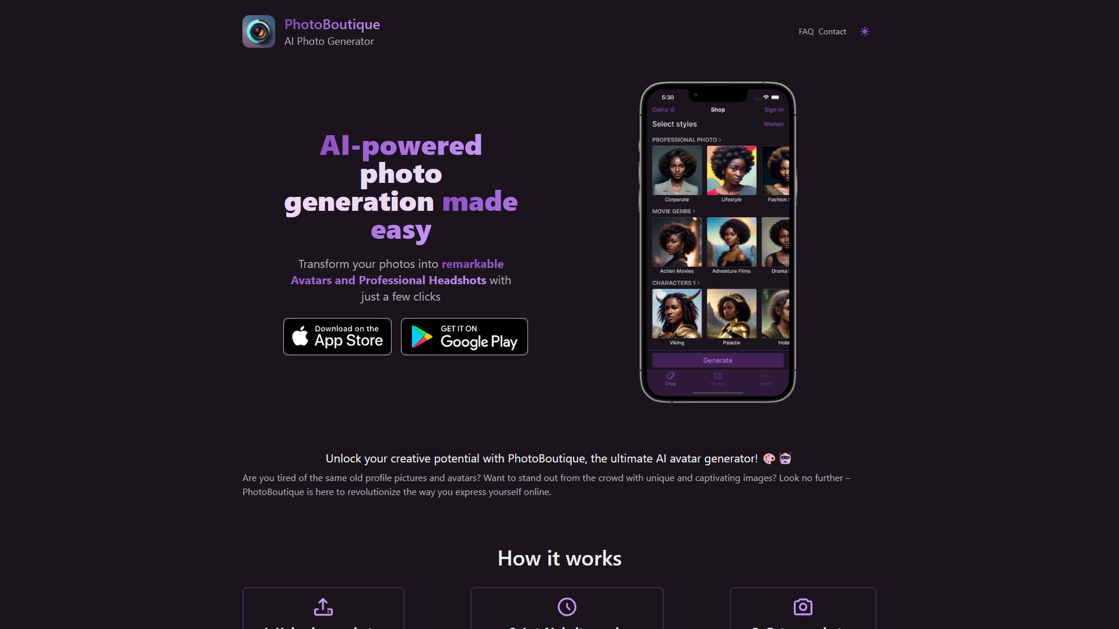 PhotoBoutique — онлайн-сервис на базе ИИ для быстрой генерации уникальных аватаров и профессиональных портретов по вашим фотографиям. Платформа помогает обновить профиль в соцсетях, мессенджерах, на работе или в портфолио без дорогих фотосессий и сложного редактирования.