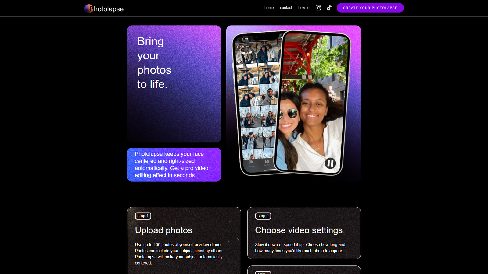 Photolapse — это онлайн‑сервис на базе ИИ для создания эффектных таймлапс‑видео лица из ваших фотографий. Он автоматически выравнивает и центрирует лицо на каждом кадре, чтобы получить плавный, «кинематографичный» эффект старения или роста во времени.