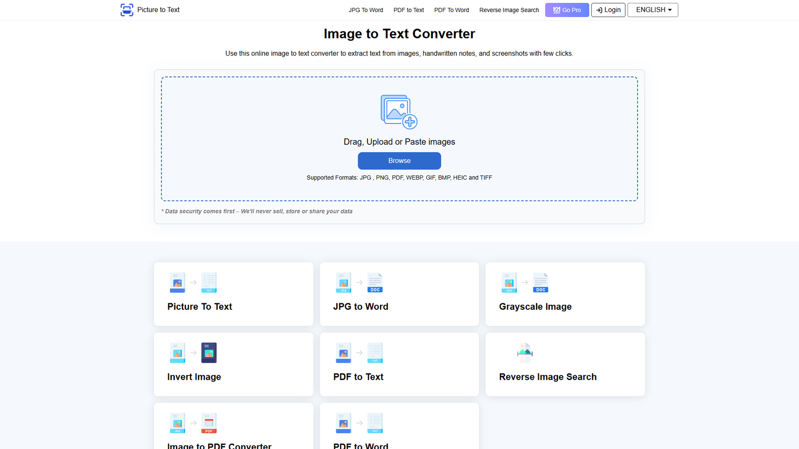 Сервис работает с JPG, PNG, PDF, WEBP, GIF, BMP, HEIC и TIFF. Пользователь перетаскивает файл в окно, загружает его с диска или вставляет из буфера обмена, после чего получает распознанный текст. Такой подход удобен для работы с документами из разных источников — от смартфона до офисного сканера.