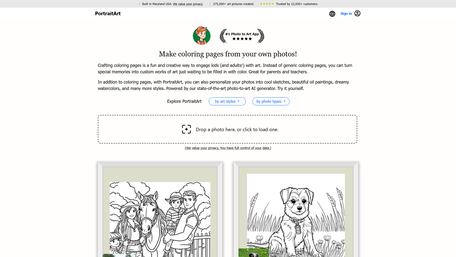 PortraitArt превращает обычные фотографии в раскраски, наброски и художественные полотна с помощью ИИ. Достаточно загрузить снимок, выбрать стиль — и на выходе получается готовый файл для печати или цифрового раскрашивания.