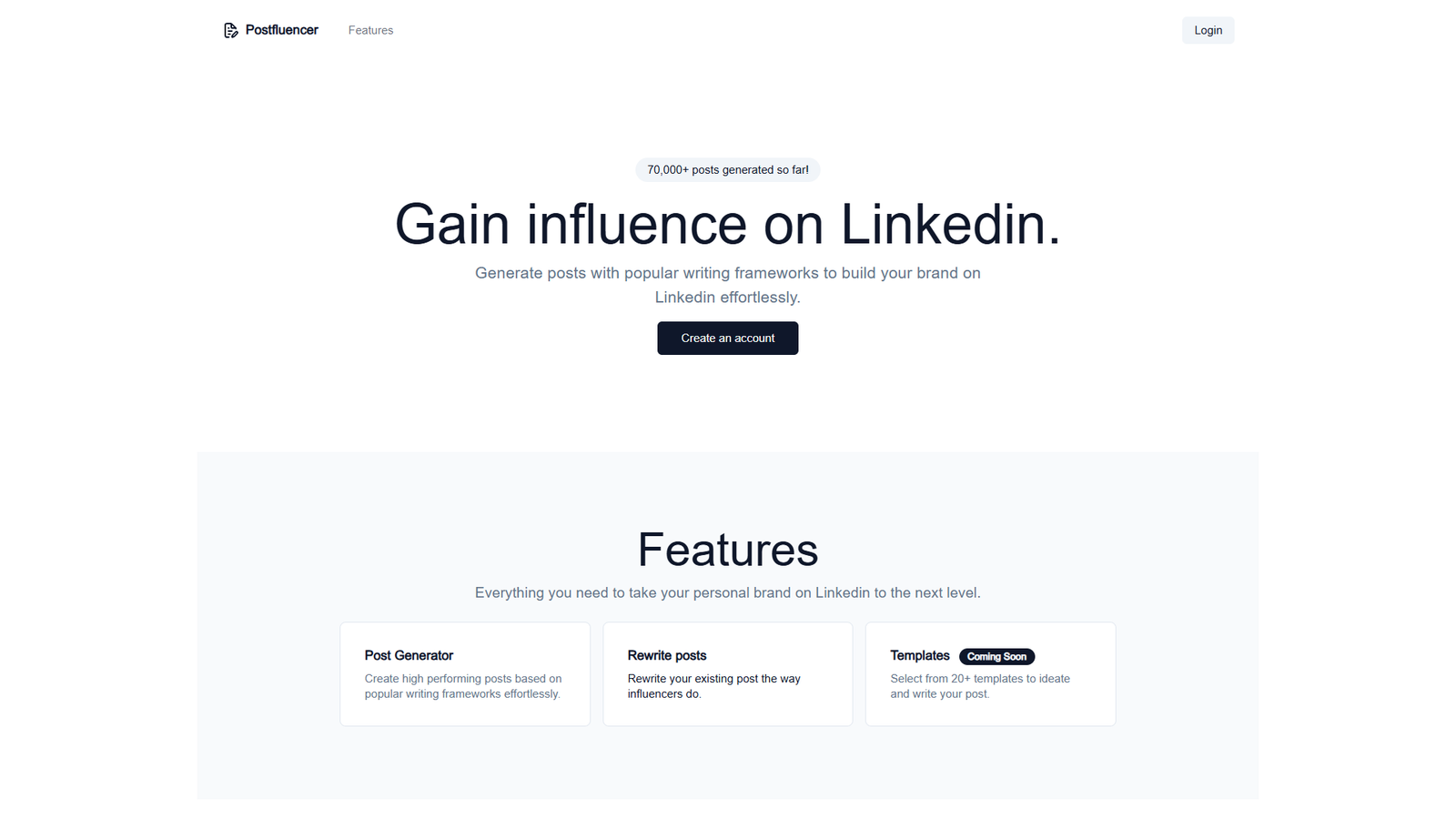 Postfluencer — это онлайн-сервис на базе ИИ для генерации постов в LinkedIn, который помогает экспертам, предпринимателям и маркетологам системно развивать личный бренд.