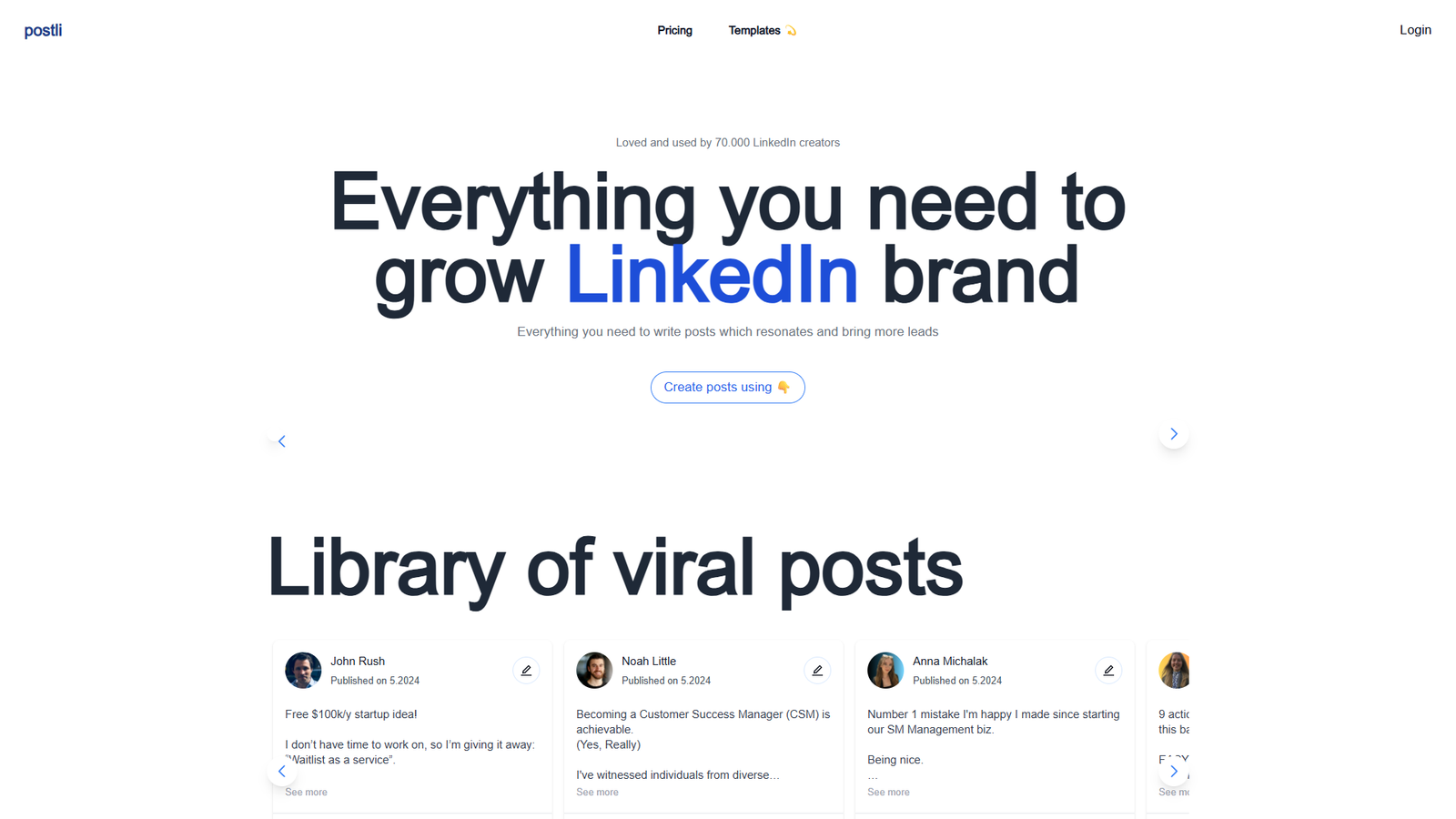Postli предлагает библиотеку из сотен реальных вирусных постов и более 1000 шаблонов. Вы можете брать готовые структуры, адаптировать их под свою нишу и получать контент, который выглядит профессионально и органично для LinkedIn.