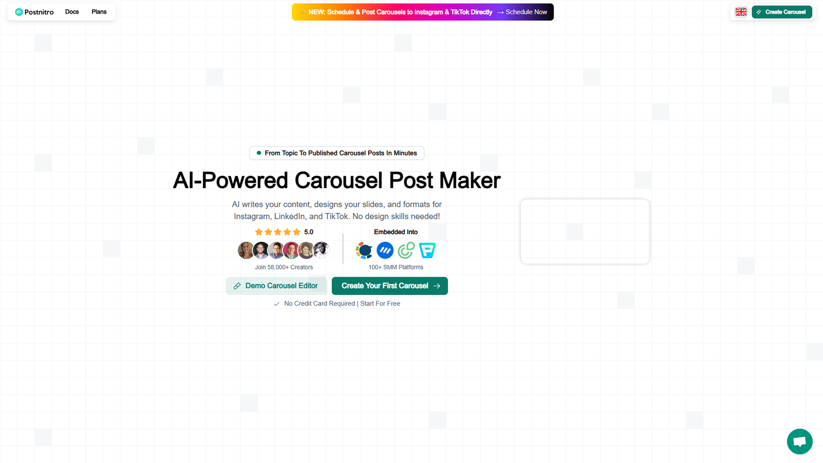 PostNitro — AI‑сервис для быстрого создания каруселей для соцсетей: от идеи и текста до готовых слайдов. Он помогает превратить тему или черновик в оформленный carousel‑пост за минуты — без навыков дизайна.