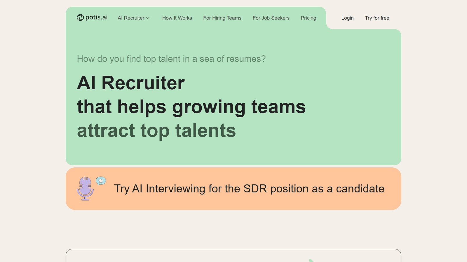 Potis AI автоматизирует ранние этапы подбора персонала с помощью нейросетевых интервью и оценок. Инструмент берёт на себя первичный контакт с каждым откликнувшимся кандидатом и помогает не терять сильных специалистов в потоке резюме.