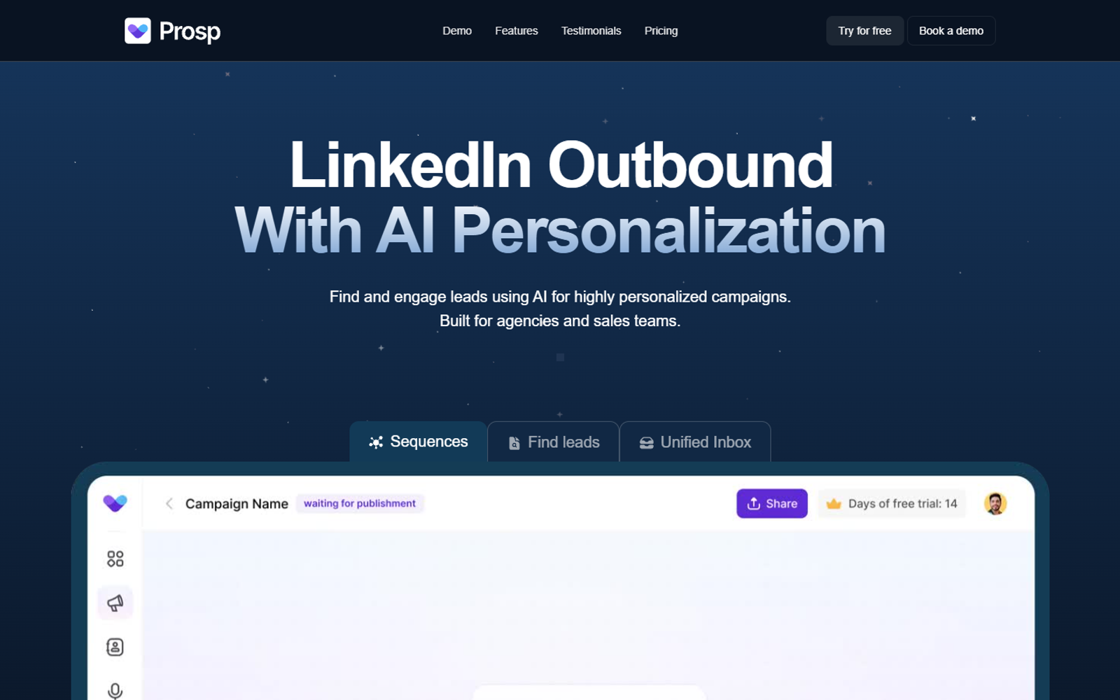 Prosp автоматизирует исходящие продажи в LinkedIn для агентств и команд продаж. Инструмент помогает находить целевых лидов, запускать персонализированные цепочки сообщений и отслеживать ответы в одном интерфейсе.