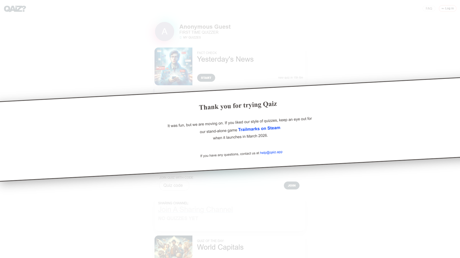 Qaiz позиционируется как AI-альтернатива Kahoot и Quizziz. Интерфейс заточен под быстрый старт: регистрация даёт бесплатные кредиты на генерацию вопросов, после чего можно сразу запускать игру и отслеживать результаты участников в реальном времени.