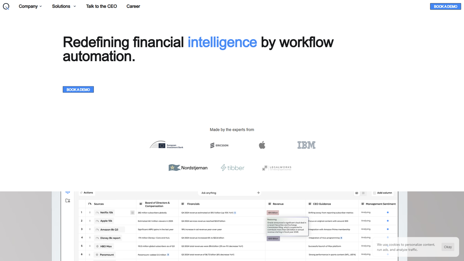 Quantera.ai — это платформа финансовых AI-агентов, созданная специально для инвестиционных банков, фондов прямых инвестиций, управляющих активами и аналитиков по акциям. Сервис автоматизирует ключевые этапы equity research, помогает быстрее находить инсайты и переводит рутинные процессы из недель в минуты.