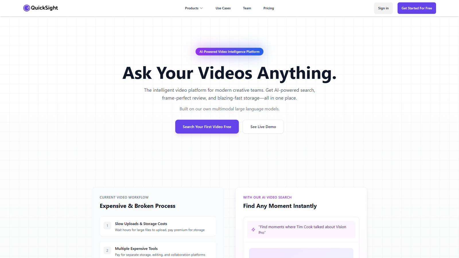 QuickSight — это система ИИ-аналитики для видео, заточенная под задачи креативных и продакшн-команд. Она помогает работать не с файлами, а с содержимым: сценами, объектами, репликами и действиями в кадре.