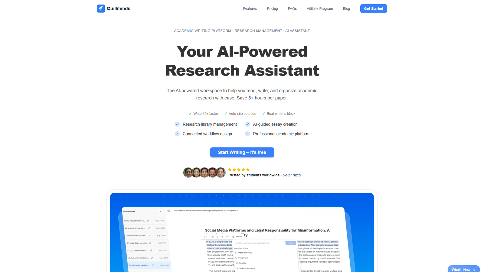 QuillMinds Academic OS — это единая платформа для академического письма, которая объединяет исследования, написание текстов и оформление ссылок в одном интеллектуальном рабочем пространстве. Сервис призван заменить связку из Zotero, Google Docs и отдельных citation-инструментов, предлагая цельный и удобный рабочий процесс.