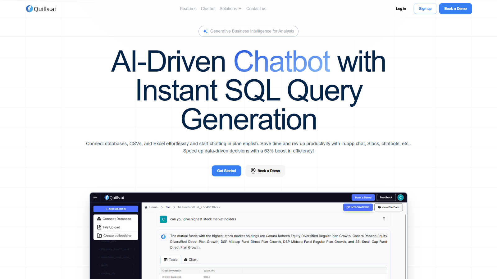 Quills AI — это генеративная BI‑платформа и умный ассистент для работы с данными, который превращает обычный текстовый запрос на английском в точные SQL‑запросы и наглядные визуализации. Сервис помогает бизнесу быстрее получать инсайты из баз данных, CSV и Excel без глубоких технических знаний.