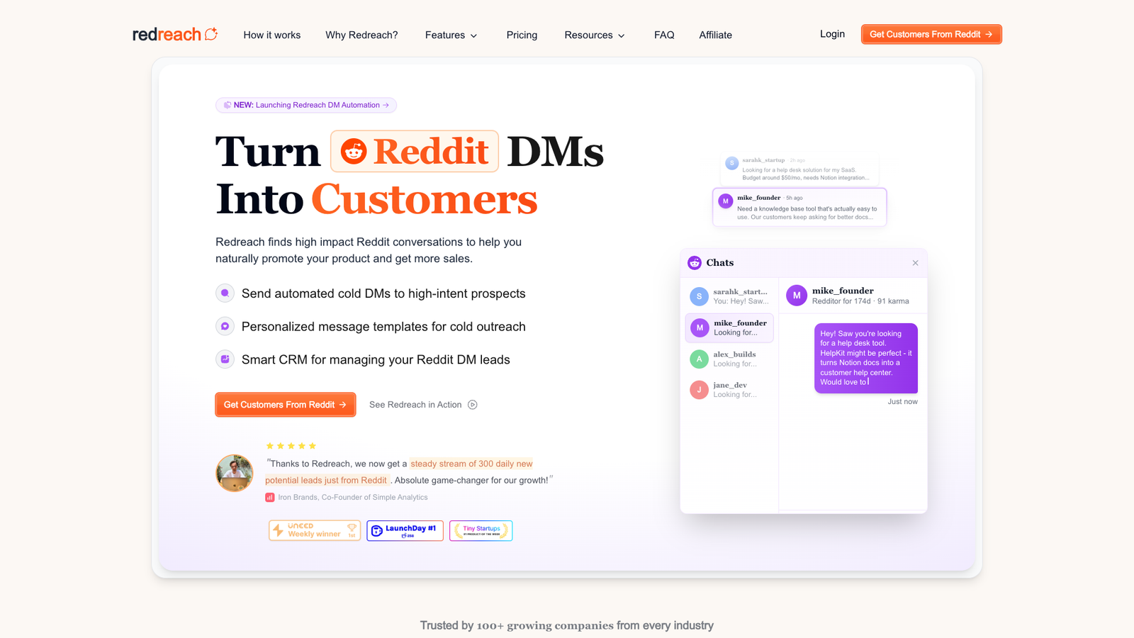 Redreach помогает находить «горячие» обсуждения на Reddit и превращать их в поток целевых лидов. Инструмент анализирует ветки, где уже есть спрос, и выводит те, в которых уместно рассказать о своем продукте без навязчивой рекламы.