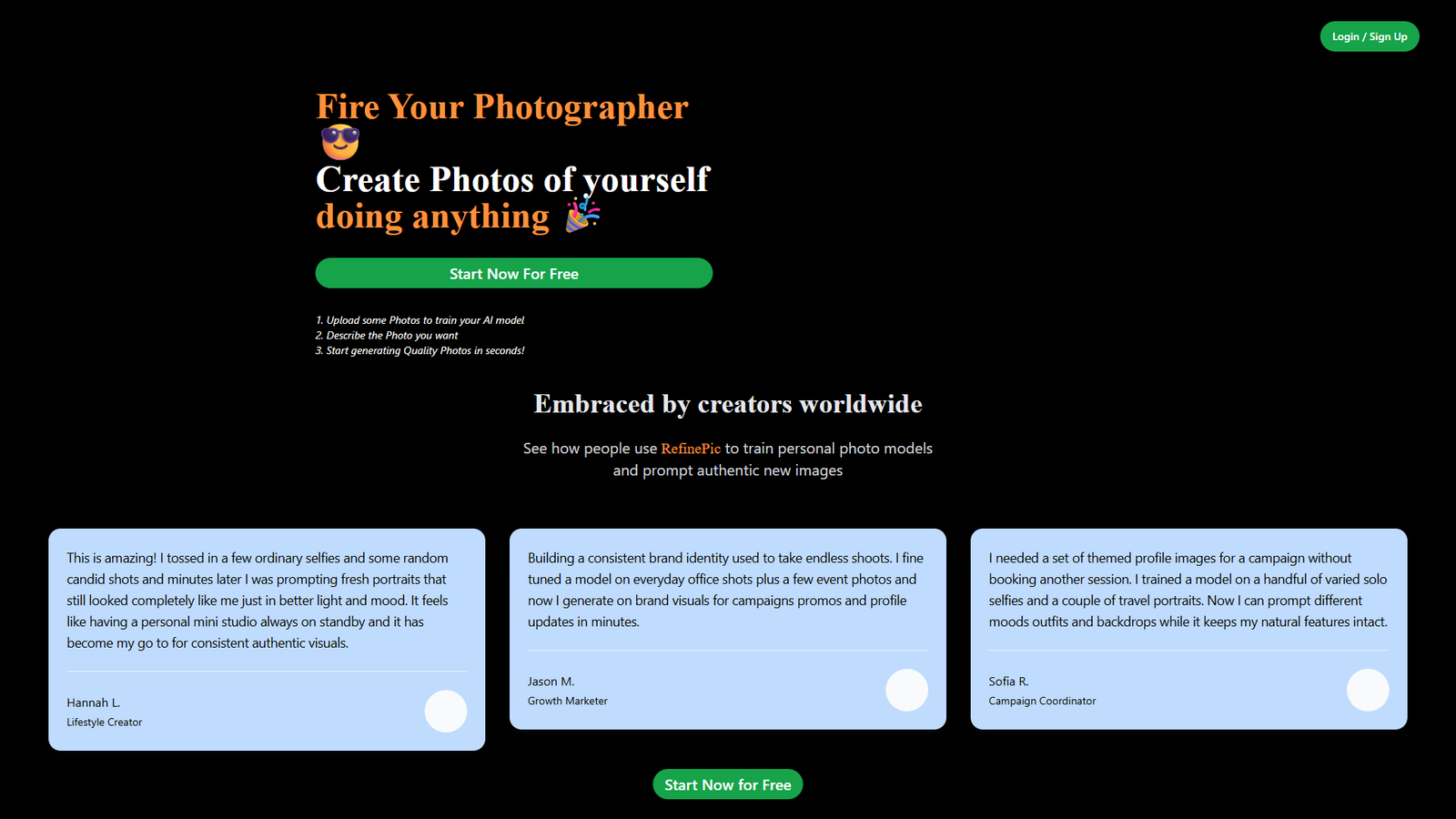 RefinePic — это онлайн‑сервис на базе ИИ, который превращает обычные селфи в профессиональные портреты и креативные фото. Вам больше не нужен личный фотограф: достаточно загрузить несколько своих снимков и описать, какое фото вы хотите получить.