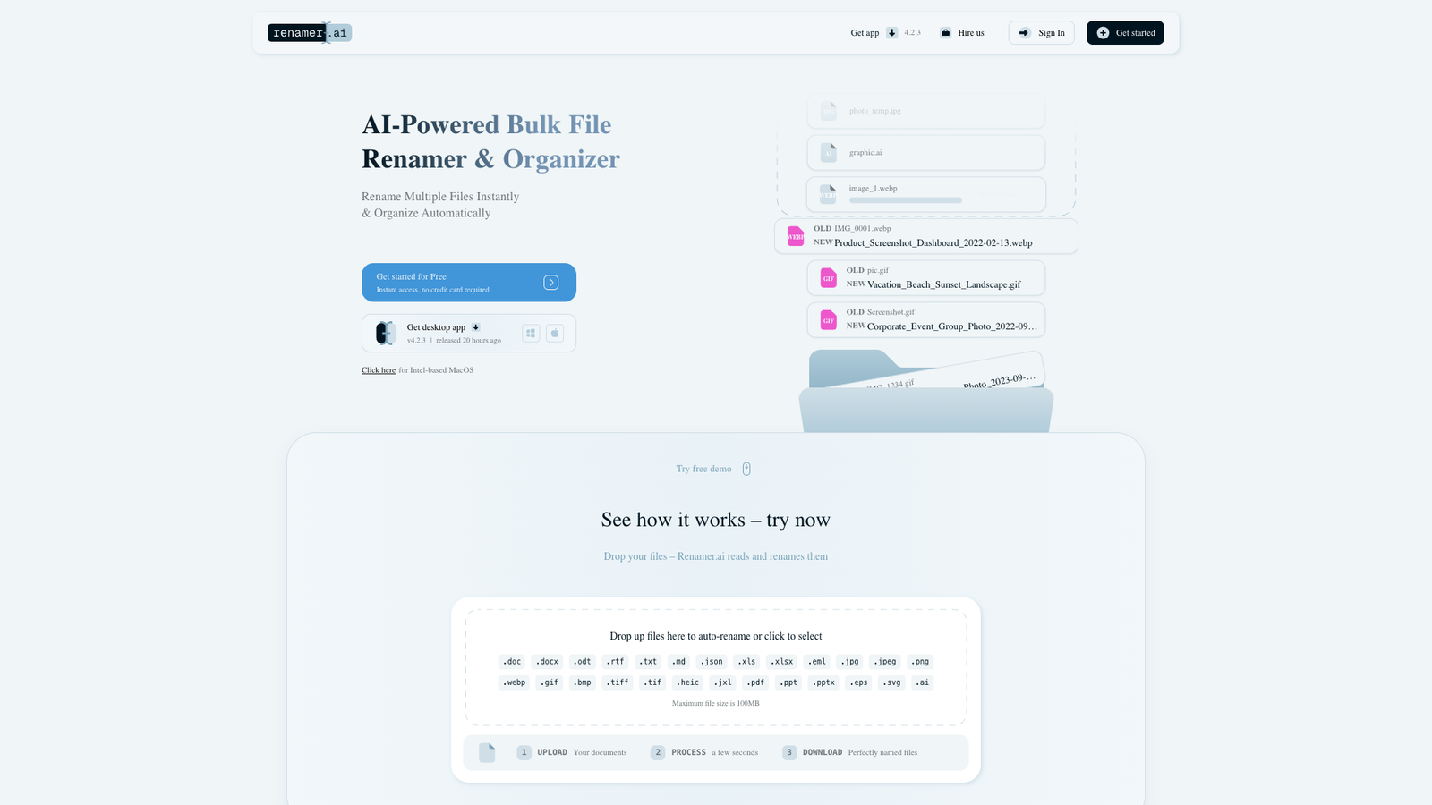 Renamer.ai автоматизирует массовое переименование файлов с помощью ИИ и распознавания текста. Инструмент ориентирован на работу с PDF, изображениями и офисными документами, где названия часто не отражают содержимое.