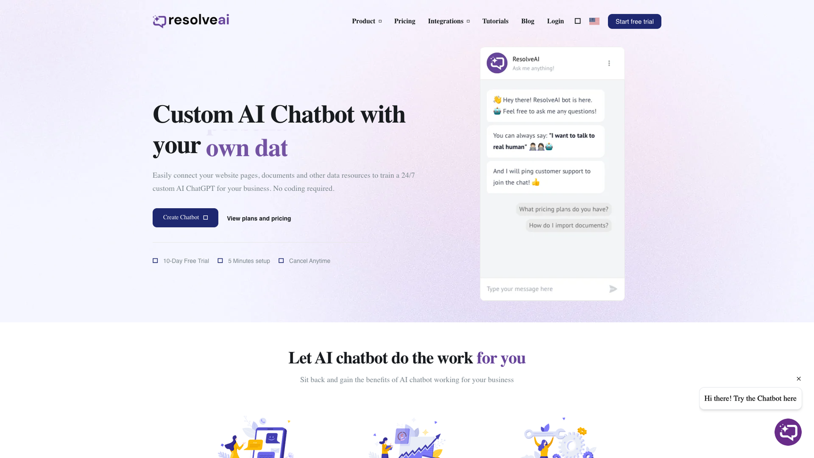 ResolveAI — конструктор кастомного чат-бота на базе ИИ, который отвечает на вопросы клиентов по вашим данным. Для обучения подключают страницы сайта, документы и другие источники знаний, чтобы бот работал как справка и консультант 24/7.