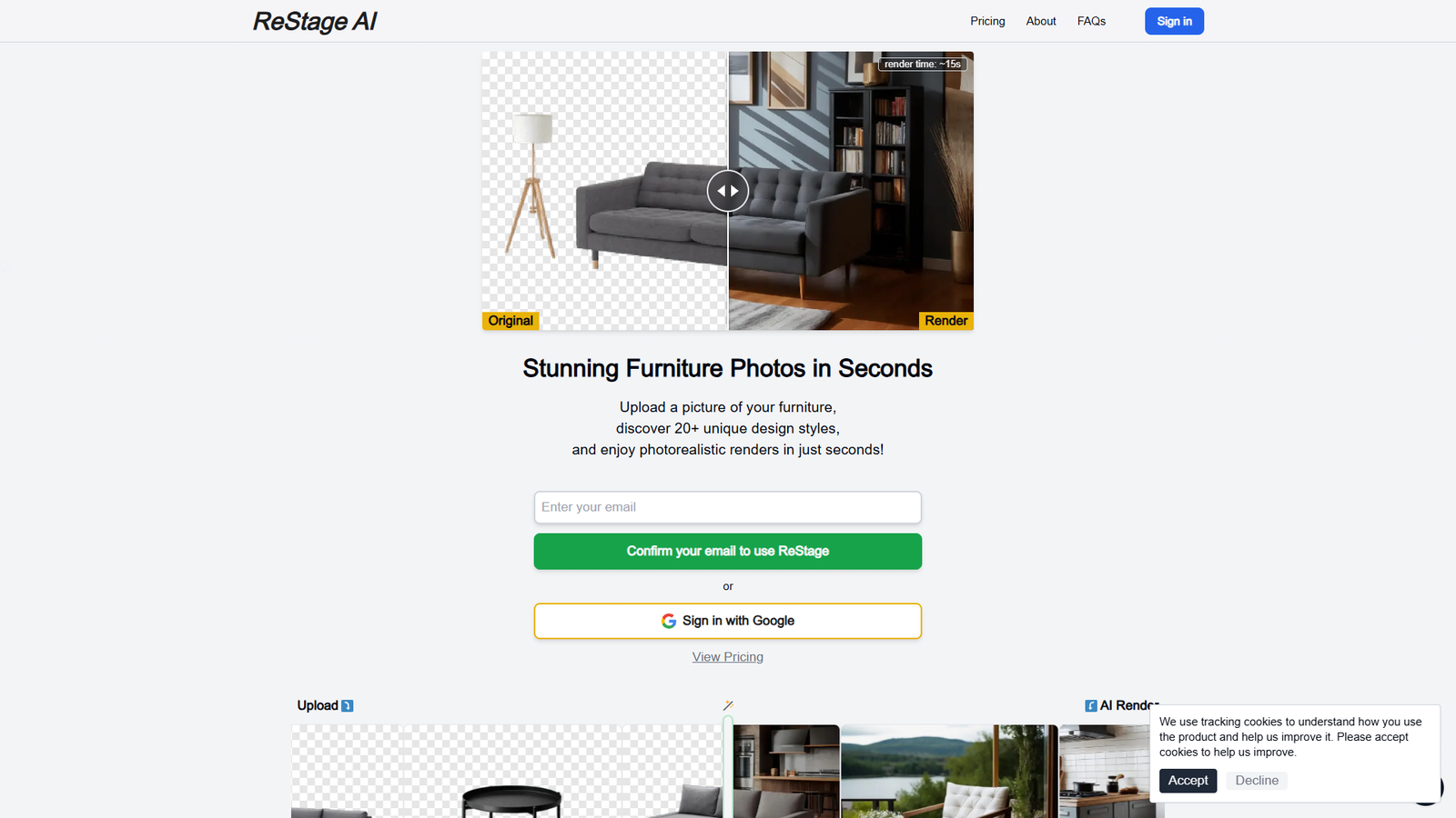 ReStage AI — это специализированный ИИ-сервис для создания впечатляющих фотографий мебели и предметов интерьера за считанные секунды. Он превращает обычные снимки товаров в студийные визуалы с реалистичными фонами и профессиональным освещением.
