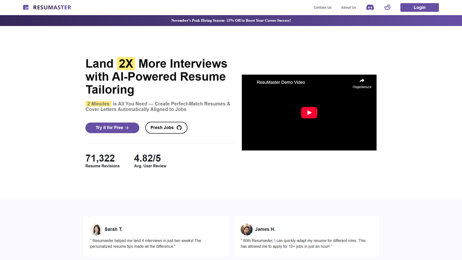 ResuMaster — это AI-сервис для быстрого создания и точной адаптации резюме и сопроводительных писем под конкретные вакансии. Платформа помогает соискателям увеличить количество приглашений на собеседования за счёт умной подгонки содержания под требования работодателя.