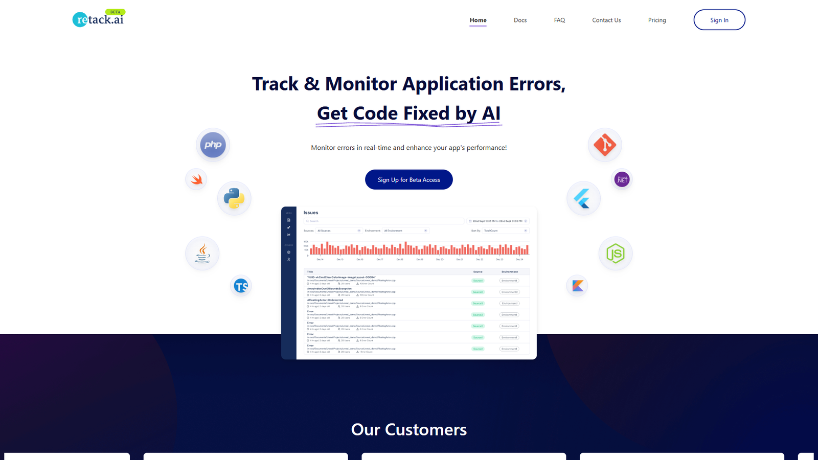 Retack AI отслеживает ошибки приложений в реальном времени и помогает автоматически исправлять код с помощью ИИ. Инструмент ориентирован на команды, работающие с Java, Python, Node.js и другими стековыми технологиями.