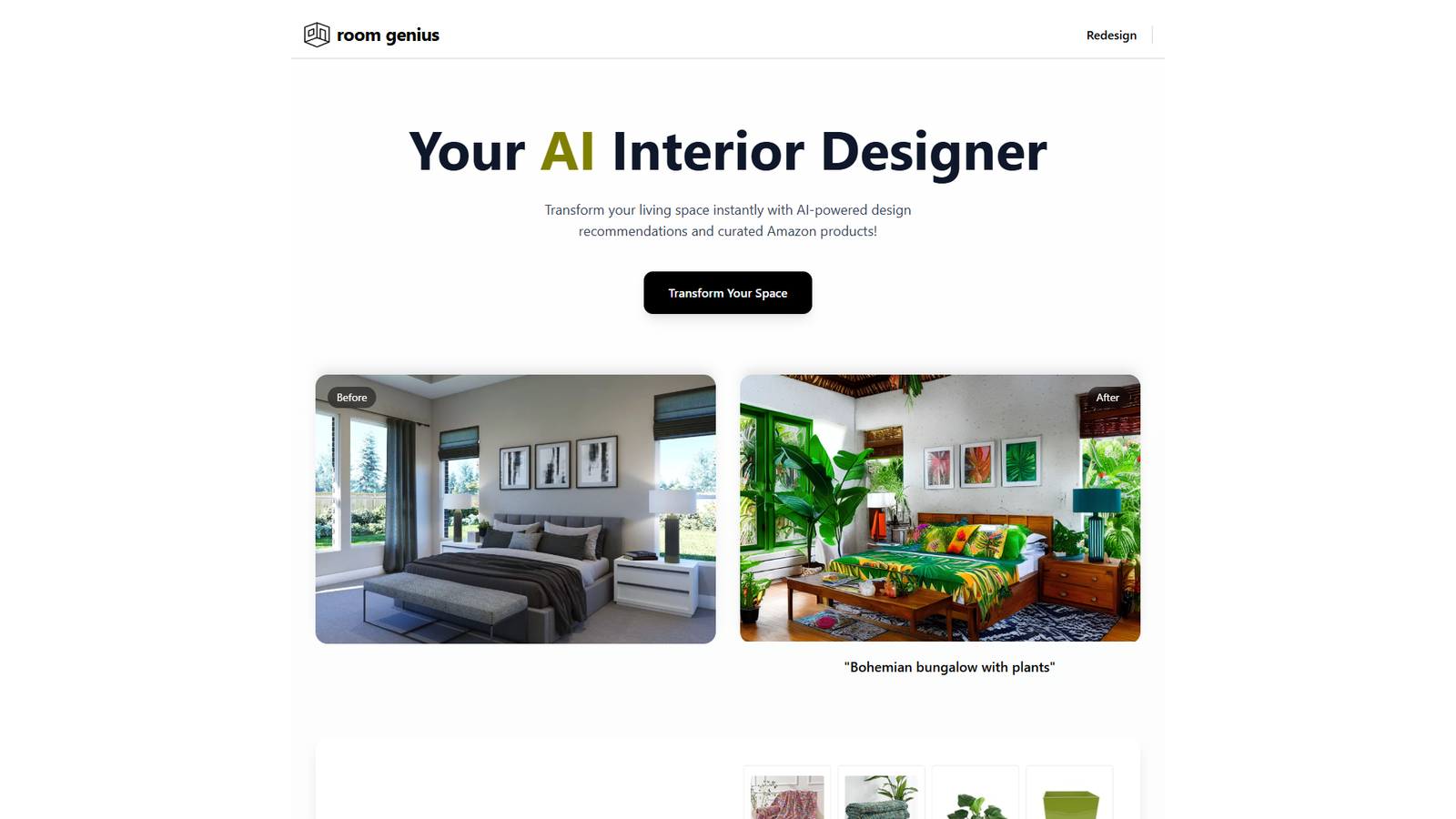 Room Genius — это онлайн-инструмент для быстрой переработки интерьера с помощью нейросети. Пользователь загружает фото комнаты, описывает желаемый стиль, а ИИ генерирует обновлённый вариант пространства с конкретными идеями по мебели и декору.