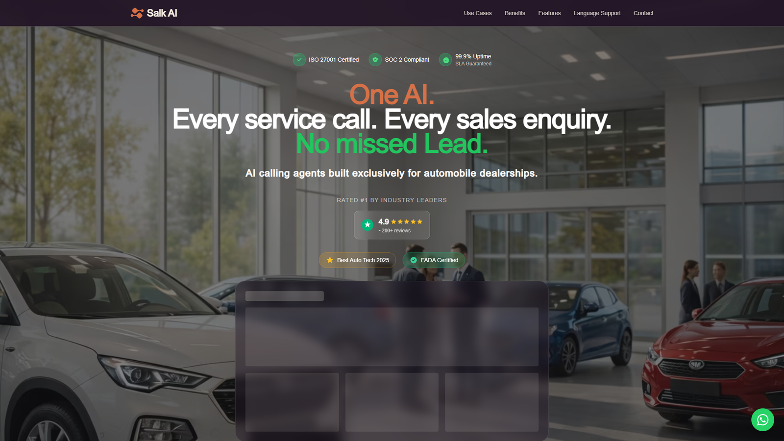 Salk AI — это специализированный AI-сервис для автодилеров и автопроизводителей (OEM), который автоматизирует звонки и коммуникацию в WhatsApp. Платформа помогает не терять ни одной заявки, обрабатывать каждый сервисный звонок и каждое обращение по продажам без участия оператора.
