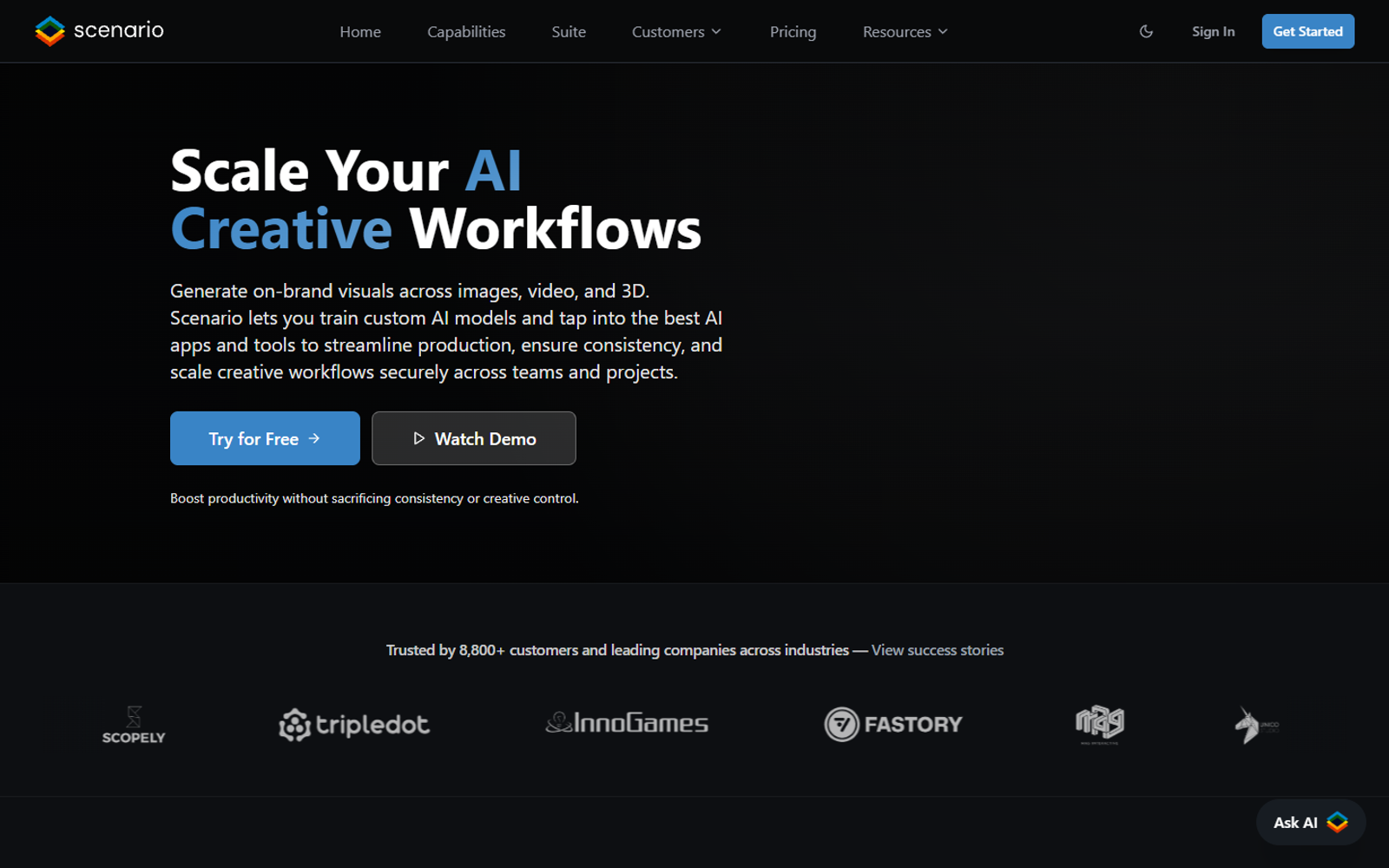 Scenario — это комплексный набор AI-инструментов для визуального контента: от 2D-изображений до видео и 3D-ассетов. Решение ориентировано на игровые студии, медиа и маркетинг, где важны единый визуальный стиль и масштабируемое производство.