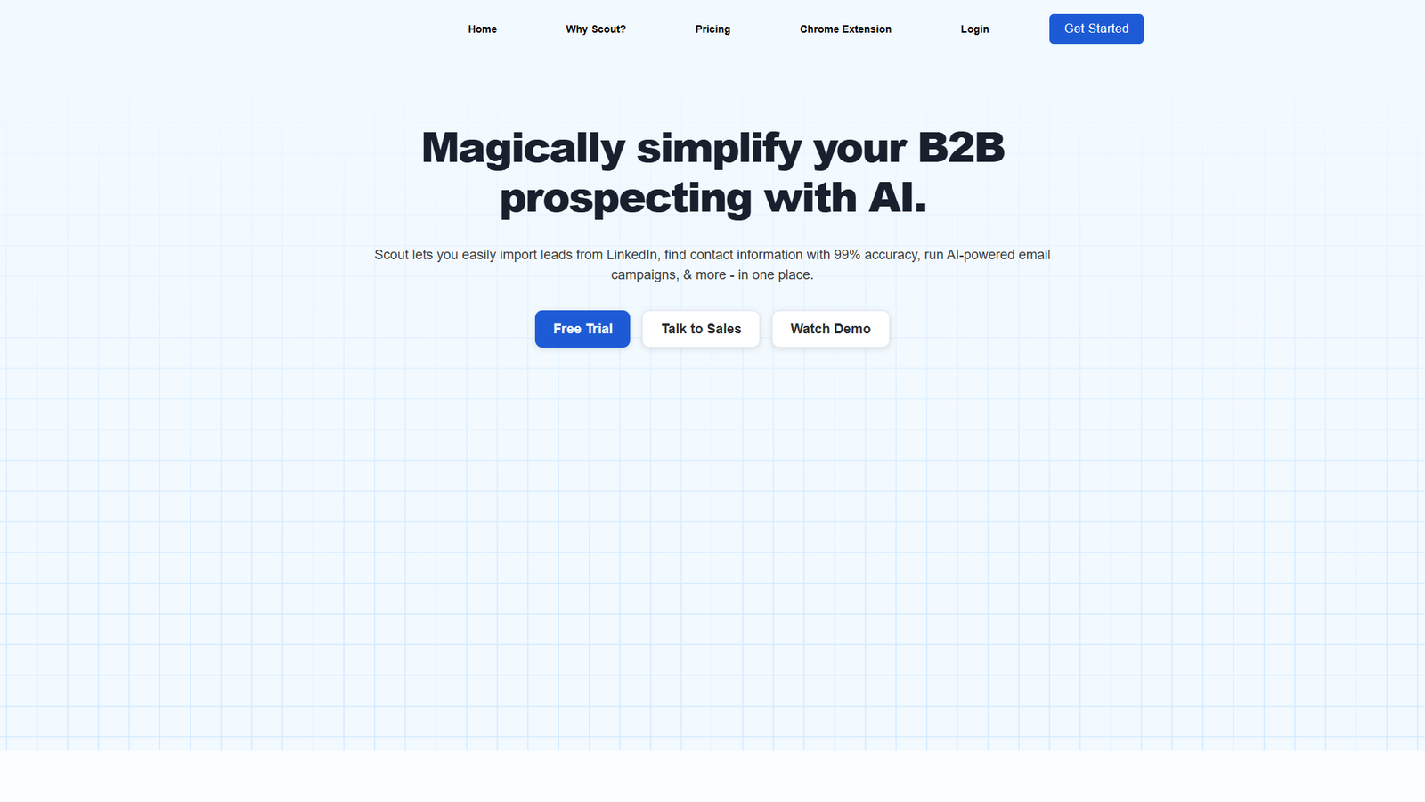 Scout — это AI-платформа для B2B-продаж, которая объединяет поиск лидов, верификацию контактов и email-кампании в одном интерфейсе. Сервис помогает командам продаж и аутрича быстрее находить целевых клиентов и запускать гиперперсонализированные рассылки без сложных настроек.