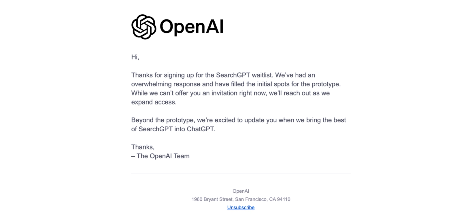 Письмо от OpenAI об участии в тестировании SearchGPT