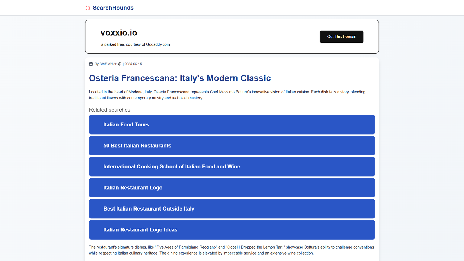 SearchHounds — это онлайн‑сервис, ориентированный на работу с доменными именами и поиском свободных доменов. Сейчас домен voxxio.io припаркован у регистратора GoDaddy, что указывает на его доступность для покупки и дальнейшего использования под ваш проект.