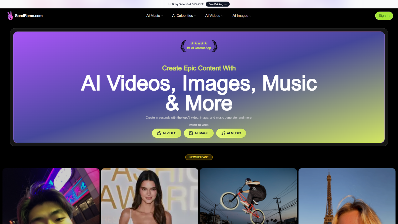 SendFame — это универсальное AI-приложение для быстрого создания вирусного контента: видео, изображений и музыки. Сервис объединяет несколько мощных генераторов в одном интерфейсе, позволяя запускать креативные проекты за секунды, без навыков монтажа, дизайна или саунд-продакшена.