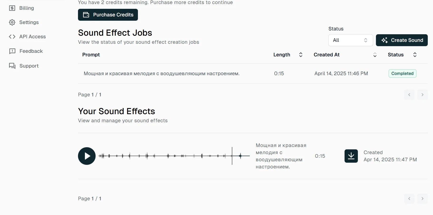 Нейросеть SFXengine генерирует звуки на основе пользовательских запросов, обрабатывая до 10 текстовых описаний одновременно. За 2025 год пользователи создали свыше 1,2 млн эффектов. Платформа поддерживает тонкую настройку параметров, включая громкость, высоту тона и реверберацию. Нейросеть предоставляет следующий функционал:
