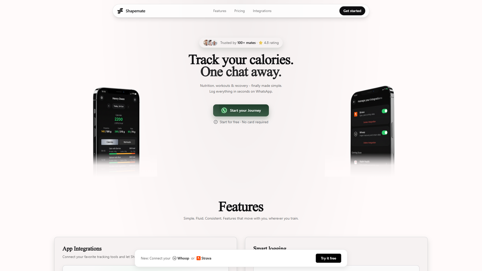 Shapemate — фитнес-ассистент в WhatsApp, который помогает отслеживать питание, тренировки и восстановление в одном чате. Вместо отдельного приложения все действия проходят в привычном мессенджере: пользователь просто пишет сообщения, а ИИ фиксирует данные и формирует статистику.